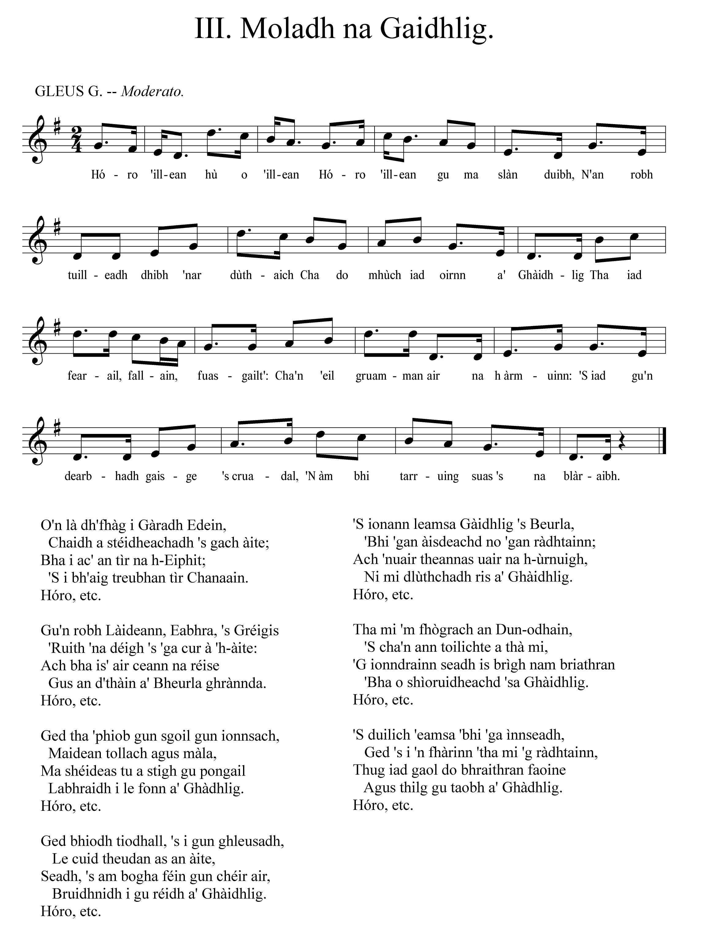 The following song is by Malcolm Campbell, a native of Luing, now deceased. It used to be in vogue in the days when the Highland Association of Glasgow gave encouragement to Gaelic singing in that city. It is one of the test Lorn songs to be sung at next Mod. The tune is a variant of that which the Glasgow Gaelic Musical Association sings “Tha e tighinn,” by Mac Mhaighstir Alasdair.