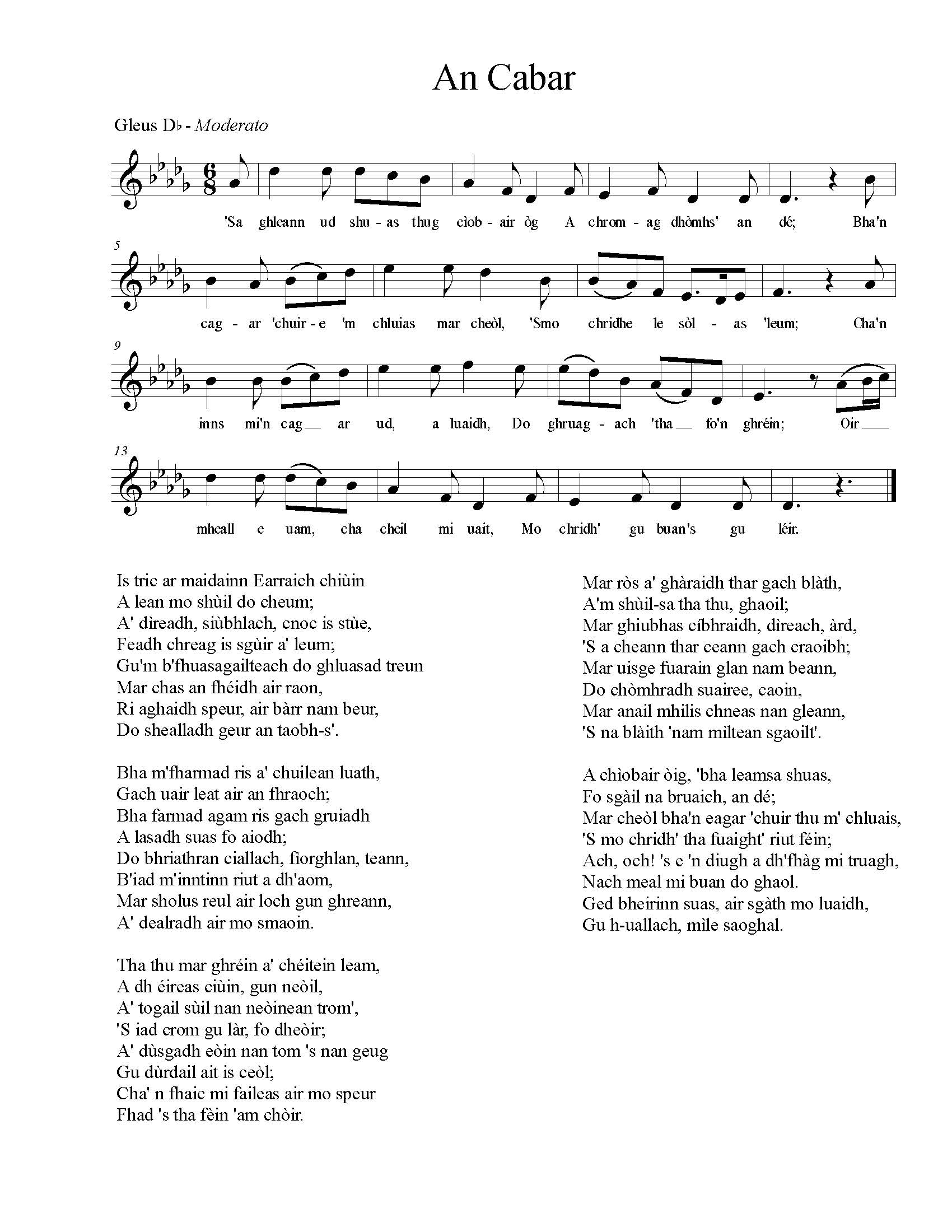 At the forthcoming Mòd in Glasgow there is to be a competition in the singing of the songs of Lorn. For this the Oban and Lorn Association have offered special prizes and have, we understand, limited the number of songs to six. The following “An Cagar” is one of the competitive pieces, the words of which are by K. W. G., the melody being in the old two-strain style.
