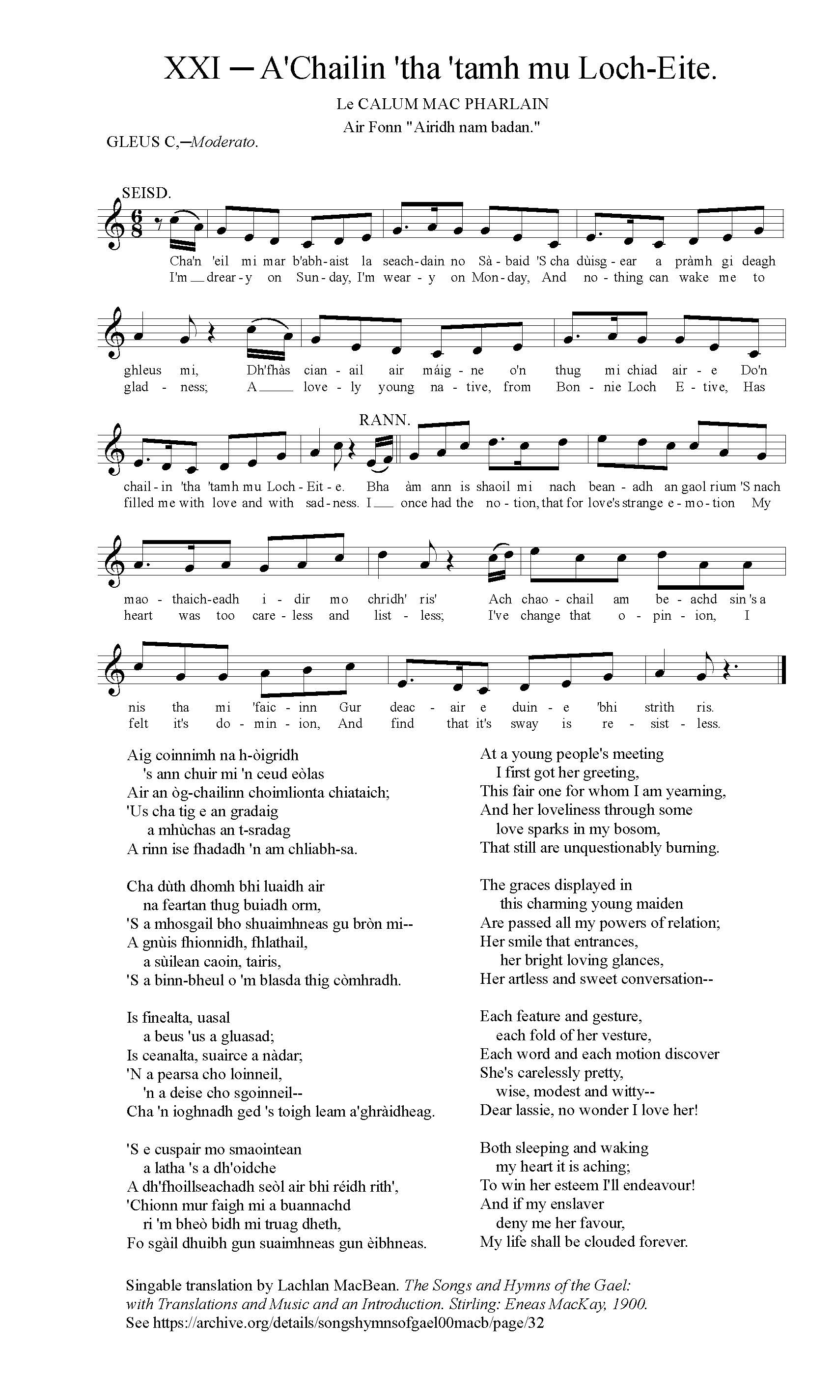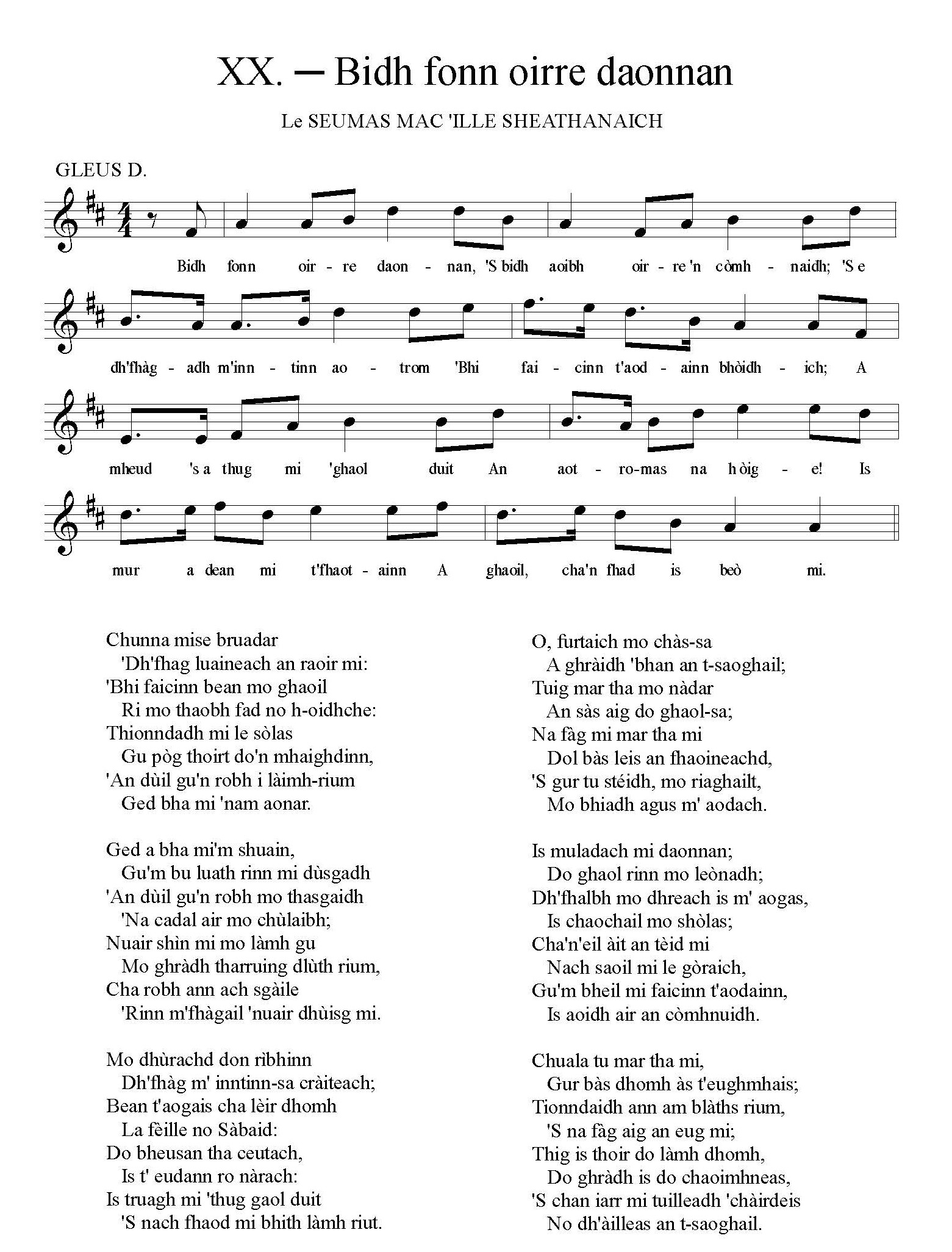 The following song is by Seumas Sea, otherwise known as Seumas Mac’ille Sheathanaich, Bard Loch-nan-eala (James Shaw, bard of Lochnell). He is said to have been born in 1758 and to have died 1828; others give the dates as 1759 and 1834. He enjoyed the patronage of General Campbell of Lochnell during his lifetime. He composed a considerable number of songs; but few were of sufficient merit to ensure preservation. The following is perhaps his best known. The names of those preserved in Turner’s collection are:–“Cumha Thighearna Bharra-challduinn,””Oran do Shir Iain Caimbeul, Tighearna nan àrd,””Gearan mu’n chain a thánig air na h-eich,””Oran do Bhonipart,””Oran do dh’Fhionnladh Marsanta.”